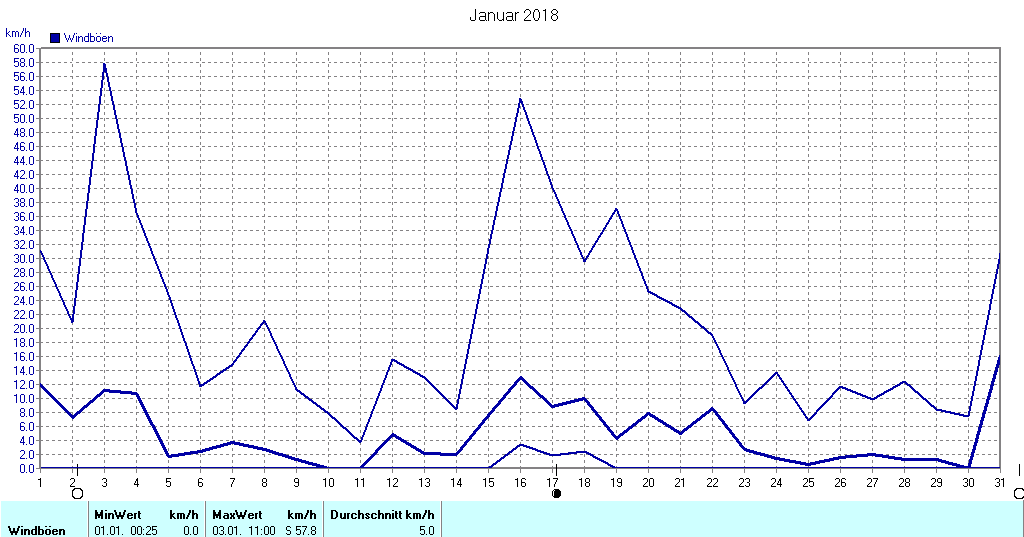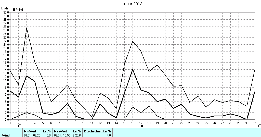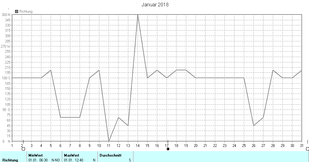 Einzelgrafiken zeigen Minimum, Mittelwert, Maximum (Regen und Windrichtung absolut)