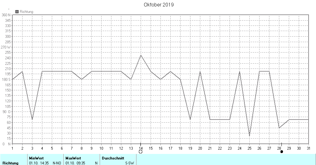 Einzelgrafiken zeigen Minimum, Mittelwert, Maximum (Regen und Windrichtung absolut)
