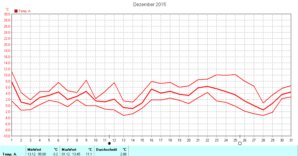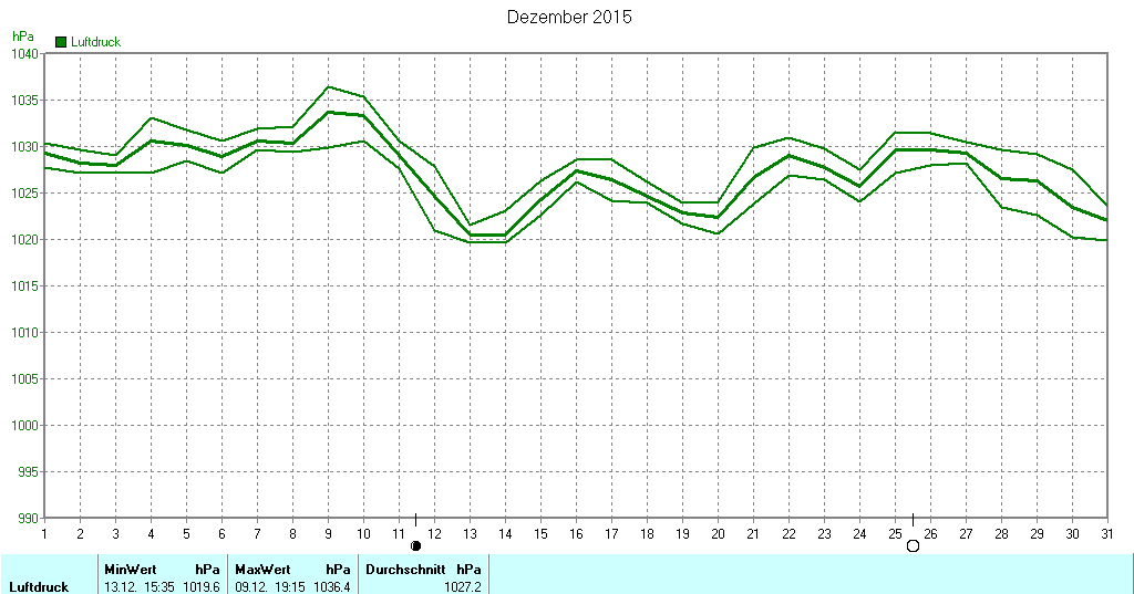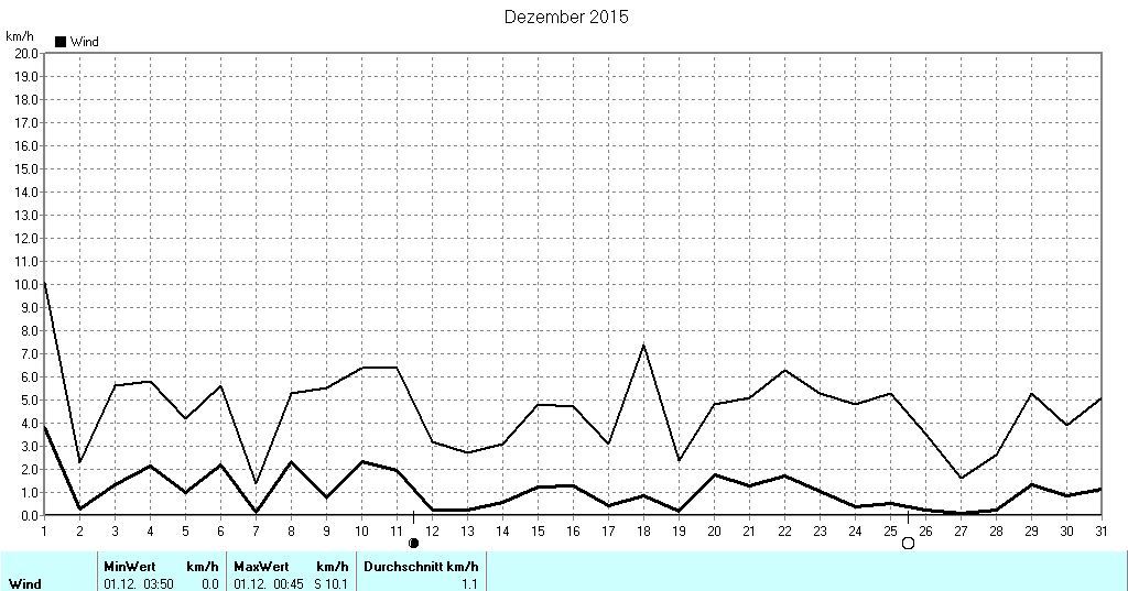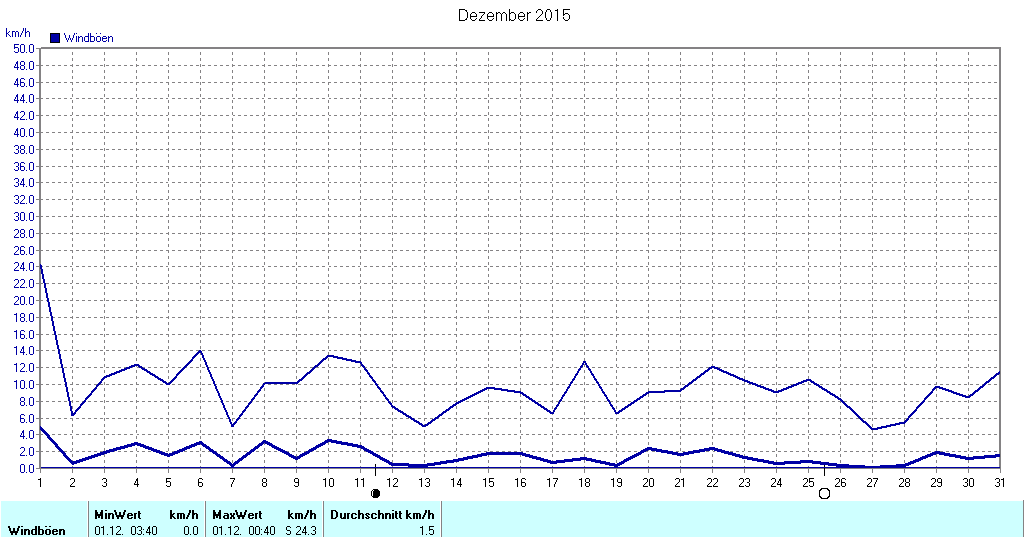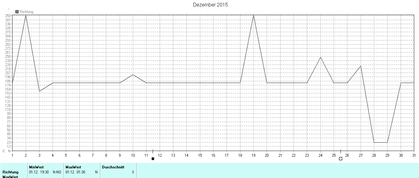Einzelgrafiken zeigen Minimum, Mittelwert, Maximum (Regen und Windrichtung absolut)