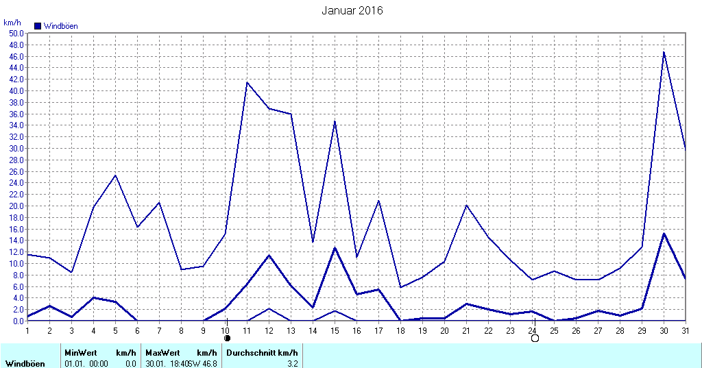Einzelgrafiken zeigen Minimum, Mittelwert, Maximum (Regen und Windrichtung absolut)