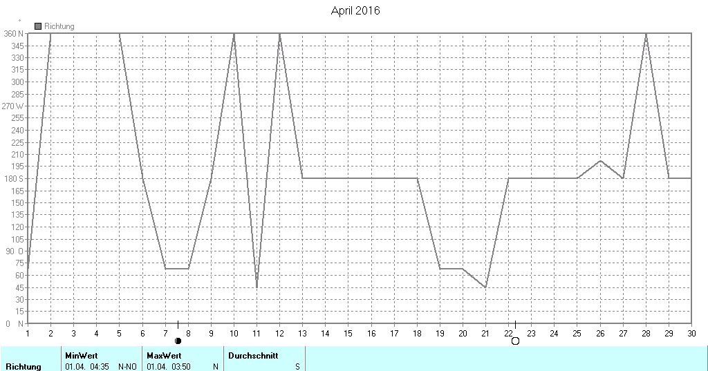 Einzelgrafiken zeigen Minimum, Mittelwert, Maximum (Regen und Windrichtung absolut)