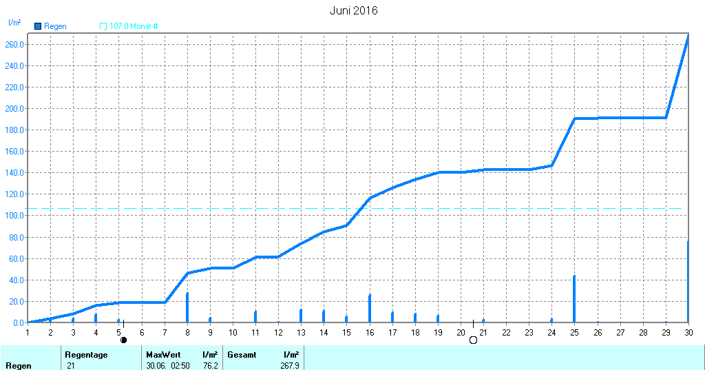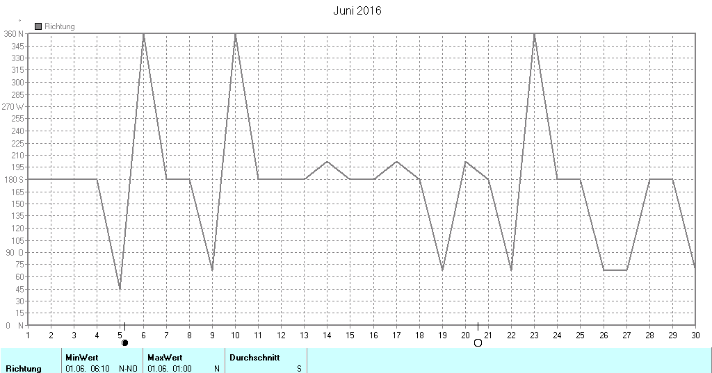 Einzelgrafiken zeigen Minimum, Mittelwert, Maximum (Regen und Windrichtung absolut)