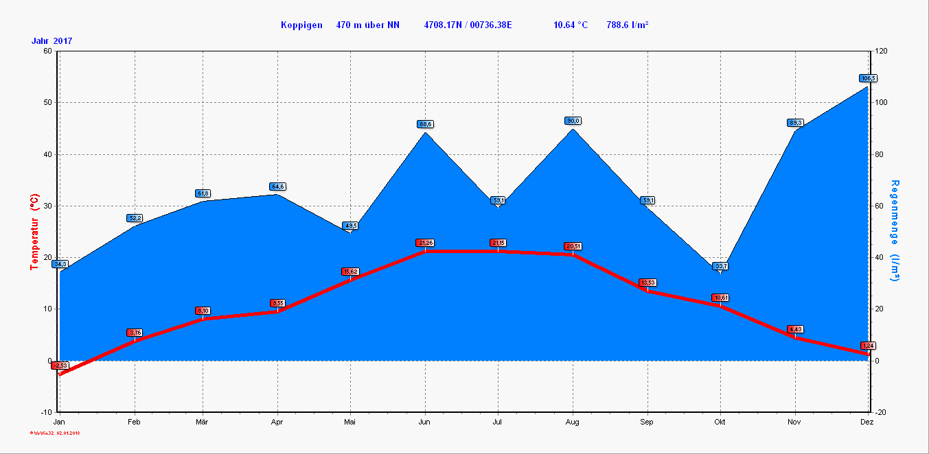 Langjährige Mittelwerte der Temperatur und Niederschlag von 1981 bis 2010 in Koppigen