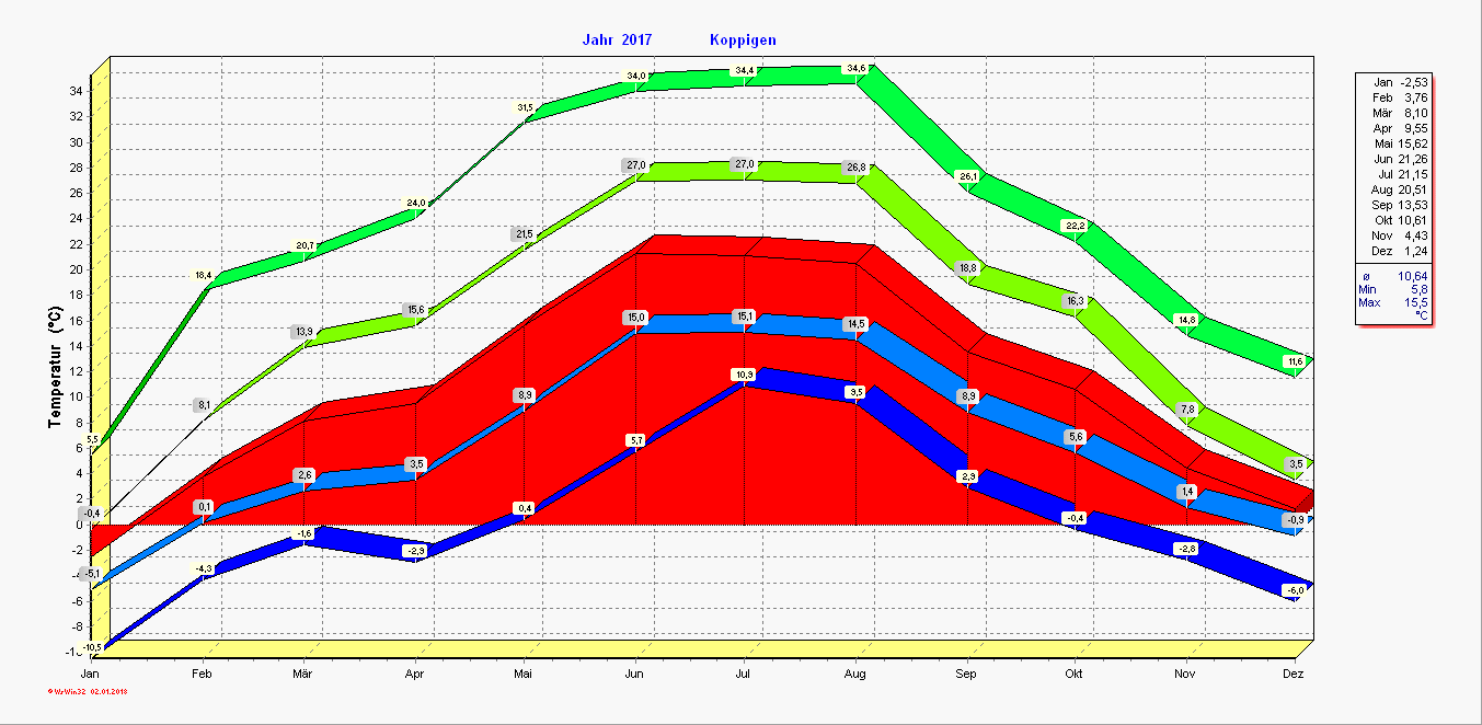 Temperatur Minimum, Mittelwert Minimum, Mittelwert, Mittelwert Maximum, Maximum