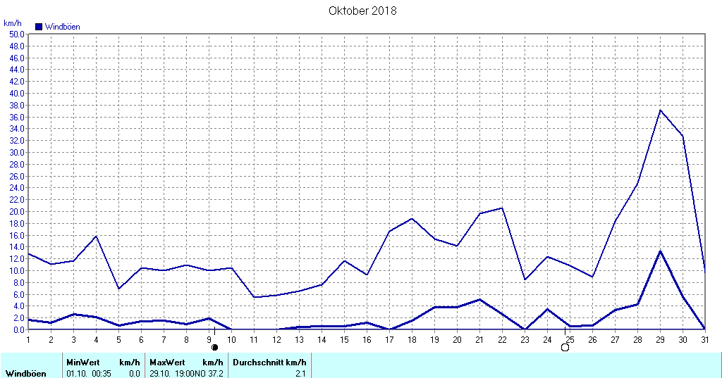 Einzelgrafiken zeigen Minimum, Mittelwert, Maximum (Regen und Windrichtung absolut)