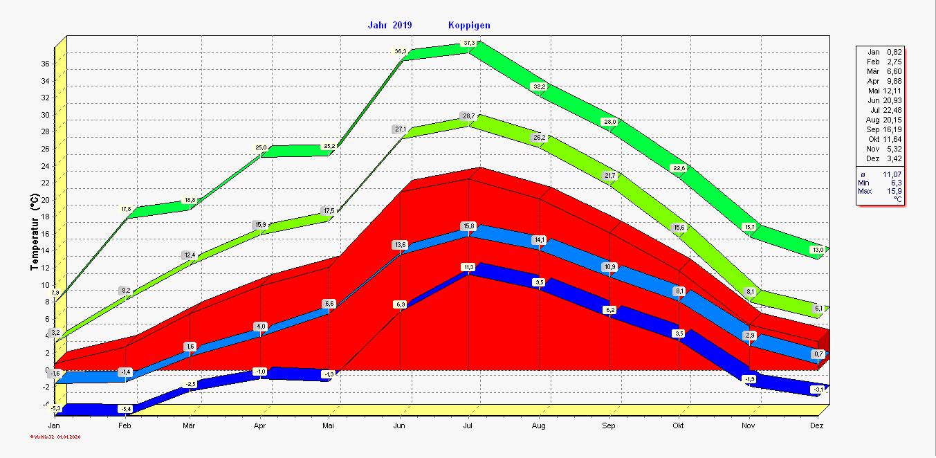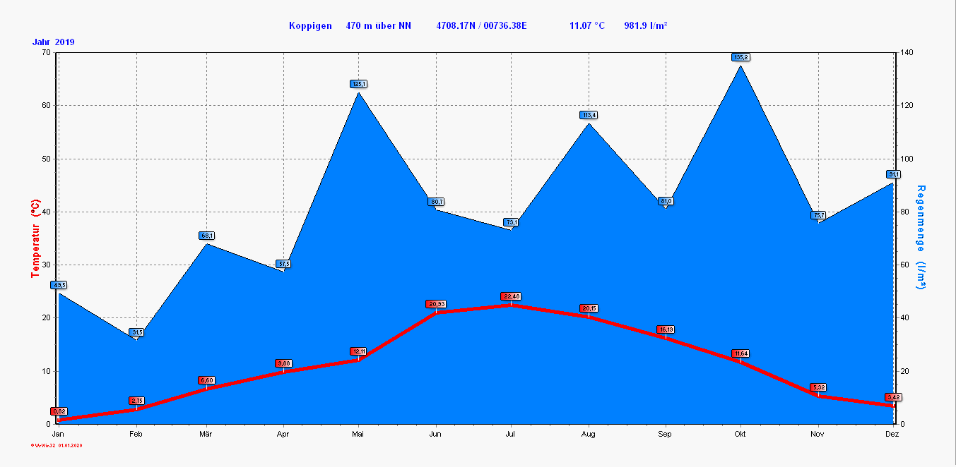 Temperaturmittelwerte und Niederschlagsmengen von 2019