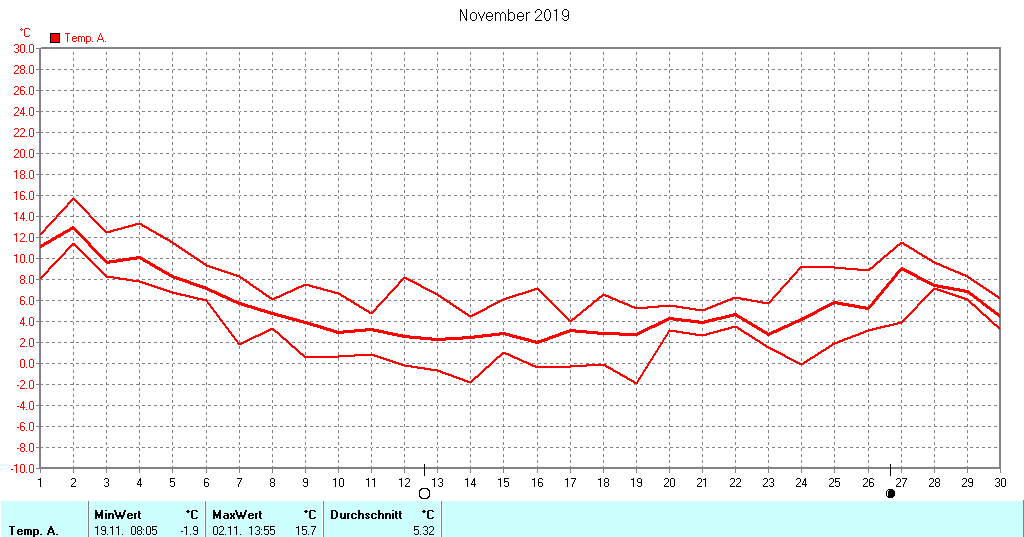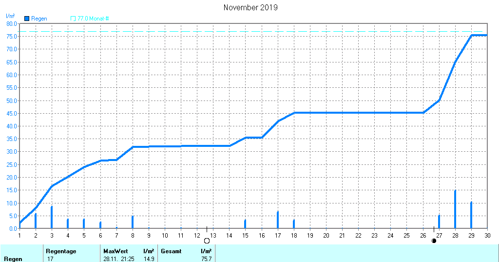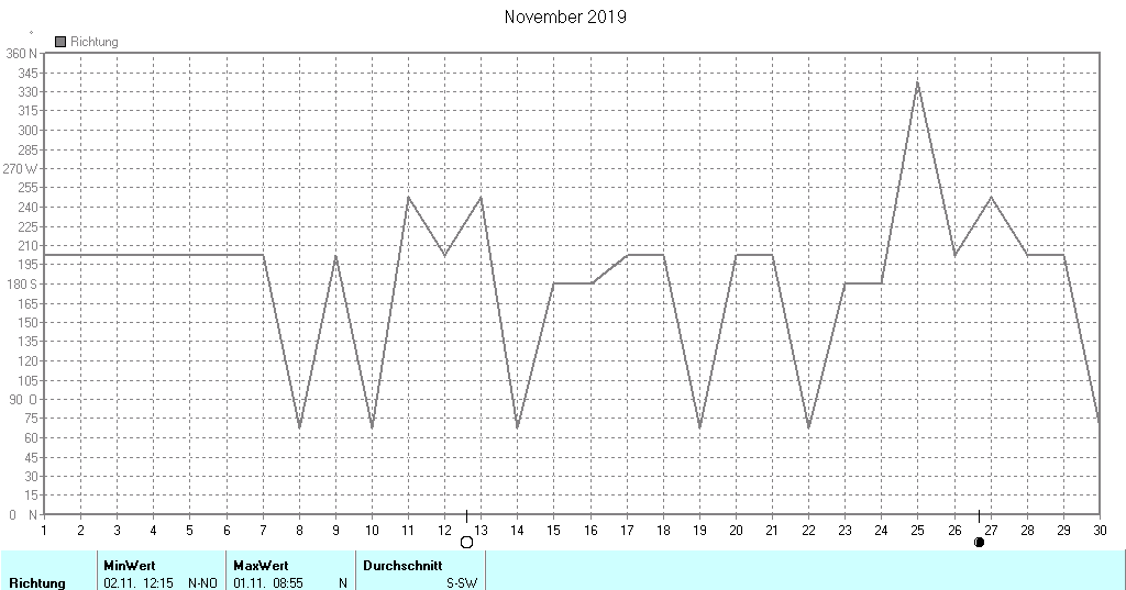 Einzelgrafiken zeigen Minimum, Mittelwert, Maximum (Regen und Windrichtung absolut)